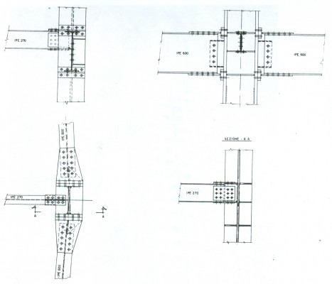 nodi a ripristino dell’omogenea resistenza al solo taglio per le travi afferenti alle colonne interne; nodi a ripristino dell’omogenea resistenza a momento e taglio per le travi afferenti alle colonne di facciata prevedendo elementi a martello come collegamento trave-colonna mediante bulloni ad alta resistenza preserrati; impiego di giunti a flangia precompressi per i giunti di estremità delle colonne. La scelta delle più opportune giunzioni in funzione del modello statico globale ha portato ad un’elevata produttività conseguente ad un risparmio notevole di forature, di bulloni e di saldature ed alla possibilità di lavorazioni automatiche sia nella foratura che nella saldatura dei pezzi.