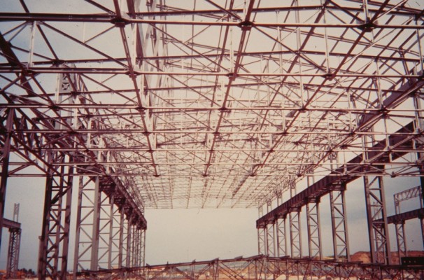 L'officina ha pianta rettangolare; è divisa in direzione longitudinale in tre blocchi da giunti di dilatazione. Longitudinalmente il passo delle colonne è 12m, trasversalmente è diviso in quattro campate con luci variabili da 17.0m a 36.0m. La copertura del fabbricato ha un’altezza pari a 12.2m e uno spazio utile di 8.0m. La C.T.A. si eleva da quota 12.2m a quota 21.7m con uno spazio utile interno compreso tra 12.2m e 19.1m.