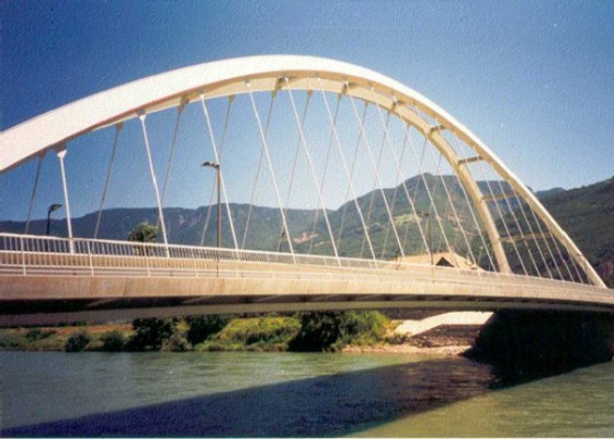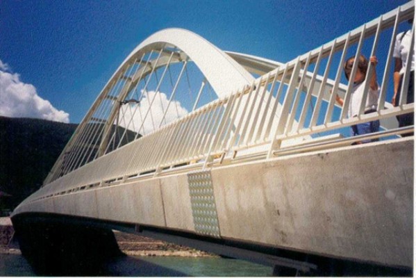 Ponte ad arco a spinta eliminata di luce di 70,4m con archi tubolari a sezione rettangolare inclinati verso il centro e tra loro collegati da irrigidimenti trasversali.