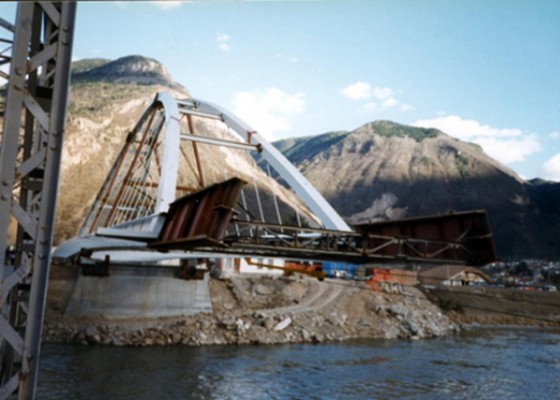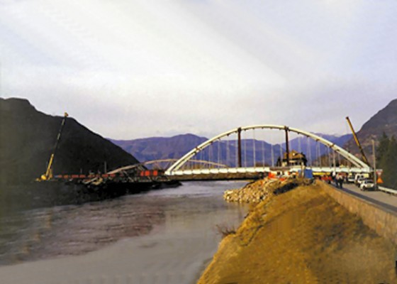 Il varo longitudinale del ponte ad una sola campata senza pile in alveo (su precisa richiesta della Committenza) ha richiesto la messa a punto di una tecnica originale. Costruiti 70m di vie di corsa in parte sopraelevati su un frutteto, stabilizzati gli archi da due telai provvisori trasversali, e collegati i pendini al solo arco, si è varato il ponte utilizzando un avambecco e un’opportuna zavorra.