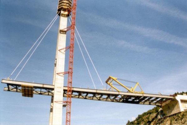 a) montaggio con varo longitudinale ed estremità a sbalzo sostenute da funi dalla testa della pila per i primi 113,67m (conci da 1 a 6) (innovazione che si richiama a quanto fatto per un ponte sospeso sullo Chavanon);
