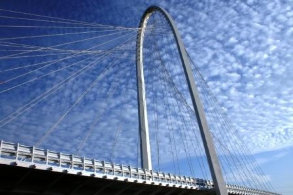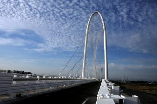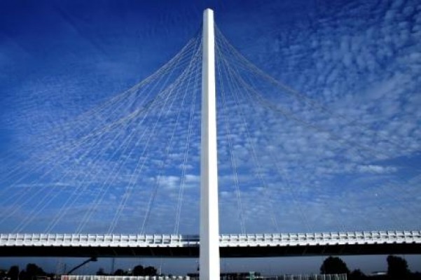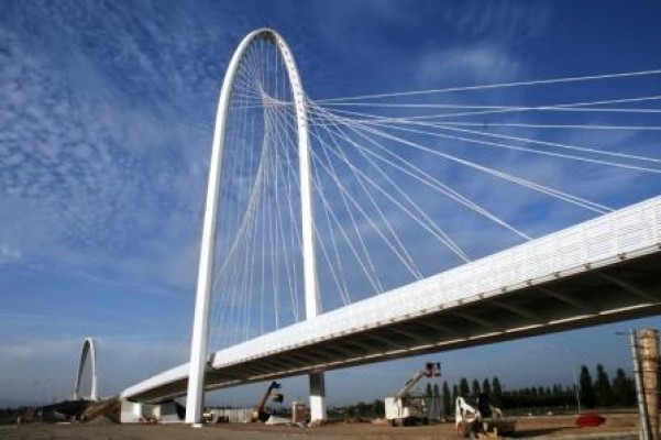 L’impalcato, appoggiato alle estremità sulle spalle (appoggi + bielle antisollevamento), incastrato in mezzeria al pilone arcuato, è anche sostenuto da 25 coppie di stralli collegate alla mezzeria dell’impalcato e lungo l’intradosso dell’arco creando un effetto altamente scenografico.