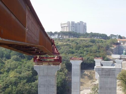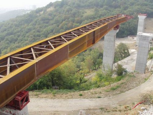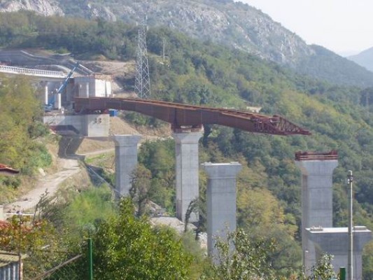 Il montaggio del ponte è avvenuto per varo longitudinale su rulliere dell’impalcato, alternando le fasi di spinta, per mezzo di argani e taglie collegate con una traversa all’impalcato, a quelle di saldatura in piazzale dei conci, lg. tipica 13,44m, in cui era stato suddiviso l’impalcato. Per il recupero della freccia dello sbalzo, l’avambecco è stato munito di dispositivo di sollevamento.