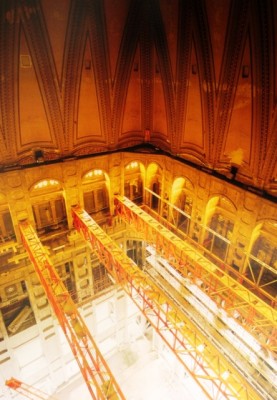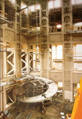 - costruzione di un impalcato provvisorio a quota + 40,5m, con funzione di sostenere l’impalcatura per il restauro della volta e per isolare e, quindi, lavorare contemporaneamente sotto e sopra quota 40,5m. La costruzione di quest’impalcato, formato da quattro travi reticolari, lunghe 25,5m, è stata realizzata utilizzando una capra di sollevamento per sollevare da quota +10m alla quota definitiva i tre tronchi (ognuno lungo 8,2m) che compongono la trave e tirfo per traslare le travi. E’ stato realizzato un doppio varo: prima di ognuno dei due tronchi laterali lungo l’asse della trave e poi, sollevato il tronco centrale e collegato ai tronchi laterali già montati, varando l’intera trave trasversalmente al proprio asse fino a portarla alla posizione definitiva, dove si collega agli elementi di estremità (nasi), lunghi 0,5m, montati direttamente all’interno delle colonne in c.a. e poggianti su appoggi in neoprene.