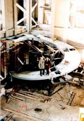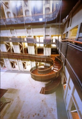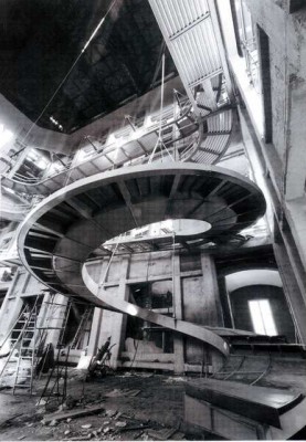 - costruzione, nella grande sala della fabbrica Antonelliana, di una scala elicoidale appesa al solo cosciale interno per mezzo di tiranti in tondo e del sistema di rampe in acciaio anch’esse appese. Particolare attenzione ha richiesto l’interfaccia tra le rampe e la vecchia struttura di rinforzo, costruita nel 1930, che aveva dei fuori piombo dell’ordine di 10cm.