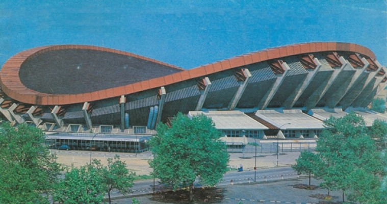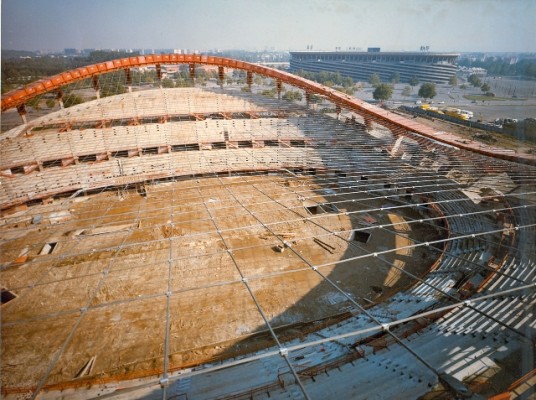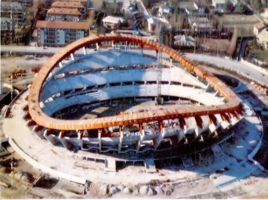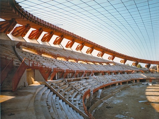 La copertura del Palasport di Milano fu assegnata alla impresa costruttrice a seguito di un appalto-concorso. Consiste nella copertura di una sala senza colonne intermedie a pianta ellittica con assi rispettivamente di 144 e 146m la cui parte centrale realizzata da una sella sviluppata secondo una superficie anticlastica a paraboloide iperbolico in tensostruttura di 128m di diametro sostenuta da 38 mensole in acciaio aggettanti dal bordo della sala verso l’interno. La massima differenza di quota dell’anello di bordo della tensostruttura è di 18,4m, ed esso risulta supportato da 38 appoggi scorrevoli. I due ordini di funi contrapposte formano, proiettate sul piano orizzontale, maglie quadrate di 2 x 2m. L’anello di bordo è una trave a cassone di acciaio con sezione 2,5 x 6,5m circa; il suo asse ha andamento prossimo a quello di una curva di intersezione del suddetto paraboloide con una superficie cilindrica coassiale. L’anello di bordo collega ad una elevatissima rigidezza rispetto agli sforzi assiali, una rigidezza flessionale molto limitata riguardo agli effetti di interazione con la rete di funi; in particolare tale deformabilità diametrale permette un elevato grado di interazione fra i due ordini di funi, caratteristica originale di questo tipo di copertura rispetto ad altri schemi che prevedono travi di bordo rigide a tale riguardo. Le mensole su cui poggia l’anello di bordo sono di acciaio ed aggettano verso l’interno dai montanti in c.a. Gli appoggi sono realizzati mediante tamponi di neoprene, acciaio e teflon, che scorrono su piastre di inox solidali alle mensole di sostegno. Tra l’anello di bordo e la rete di funi è stata interposta una trave ausiliaria di aggancio alle funi, fissata alla trave di bordo e realizzata con andamento altimetrico, diverso da quello della trave anulare, e tale da avvicinare le forze applicate dalle funi all’asse della trave di bordo. Questa tecnica ha permesso una comoda standardizzazione nella costruzione della trave di bordo.
